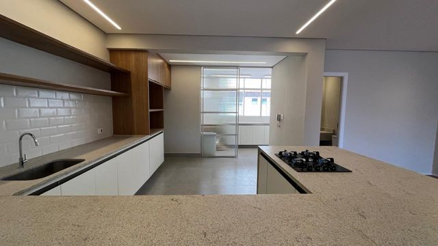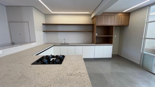 A cozinha em conceito aberto possui bancada americana em granito e piso em porcelanato, integrada a uma área de serviço ampla e independente.