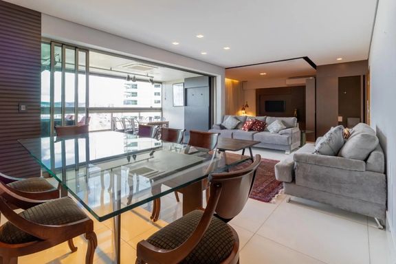 Apartamento 4 quartos mobiliado com uma varanda incrível, ideal para famílias que exigem qualidade de acabamento e que valorizam os momentos que passam juntos dentro de casa. Sala muito espaçosa, com belos painéis e iluminação planejada. Varandão gourmet e uma vista única para as montanhas. Andar alto. Possui Lavabo. Cozinha espaçosa com ótimos armários e área de serviço com DCE. Quatro quartos sendo 2 suítes com ar condicionado. Quartos com armários e suíte master com closet e hidromassagem. 4 Vagas na garagem